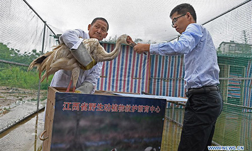 Wildlife protection workers put a rescued baby crane into a box for transportation in Nanchang, east China's Jiangxi Province, May 7, 2018. The baby crane was found alone and unable to stand up near the Poyang Lake in east China's Jiangxi Province on April 24. It was sent to a provincial wildlife care and breeding center for recovery before being transfered to Melmeg National Nature Reserve. (Xinhua/Wan Xiang)