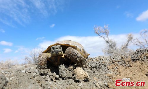 A Central Asian tortoise is found at Ebi Lake wetland natural reserve, in Northwest China's Xinjiang Uygur Autonomous Region, April 23, 2019. The tortoise was about 30 years old. The species is endemic to Central Asia, and in China, it's found only in the autonomous region's Huocheng County, placed under first-class wildlife protection. (Photo: China News Service)