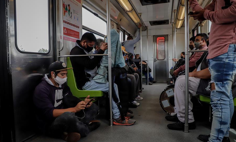 People are seen wearing masks on public transport in Mexico City, Mexico, July 28, 2020. Mexico registered 7,208 new COVID-19 cases, bringing the nationwide count to 402,697 cases, the health ministry said Tuesday. (Str/Xinhua)