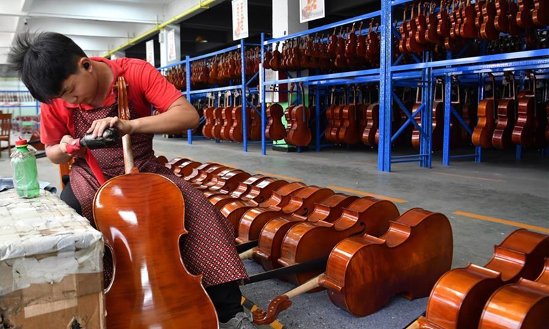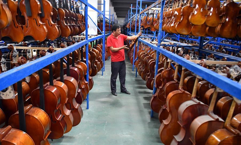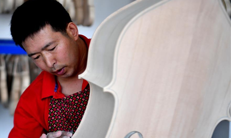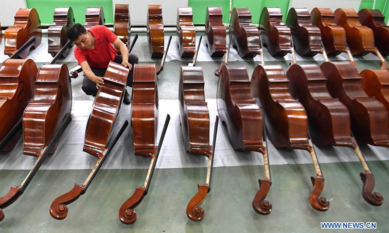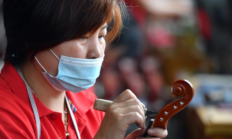 A worker checks a product at a violin workshop of Queshan Violin Industrial Park in Queshan County of Zhumadian City, central China's Henan Province, June 23, 2020. With an annual output of about 400,000 violins, Queshan produces more than 80 percent of made-in-China medium and high-quality violins, violas, cellos, bass and violin accessories. About 90 percent of violin-related products from Queshan are made for exports to Italy, the United States, Germany and Hungary, generating an annual revenue of more than 10 million U.S. dollars. (Xinhua/Li Jianan)