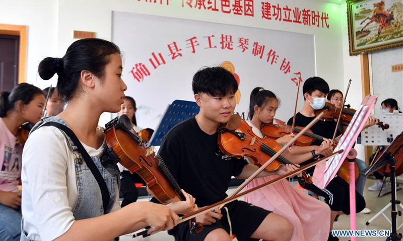 People attend a rehearsal at a hand-made violin producers' association in Queshan County of Zhumadian City, central China's Henan Province, July 4, 2020. With an annual output of about 400,000 violins, Queshan produces more than 80 percent of made-in-China medium and high-quality violins, violas, cellos, bass and violin accessories. About 90 percent of violin-related products from Queshan are made for exports to Italy, the United States, Germany and Hungary, generating an annual revenue of more than 10 million U.S. dollars. (Xinhua/Li Jianan)