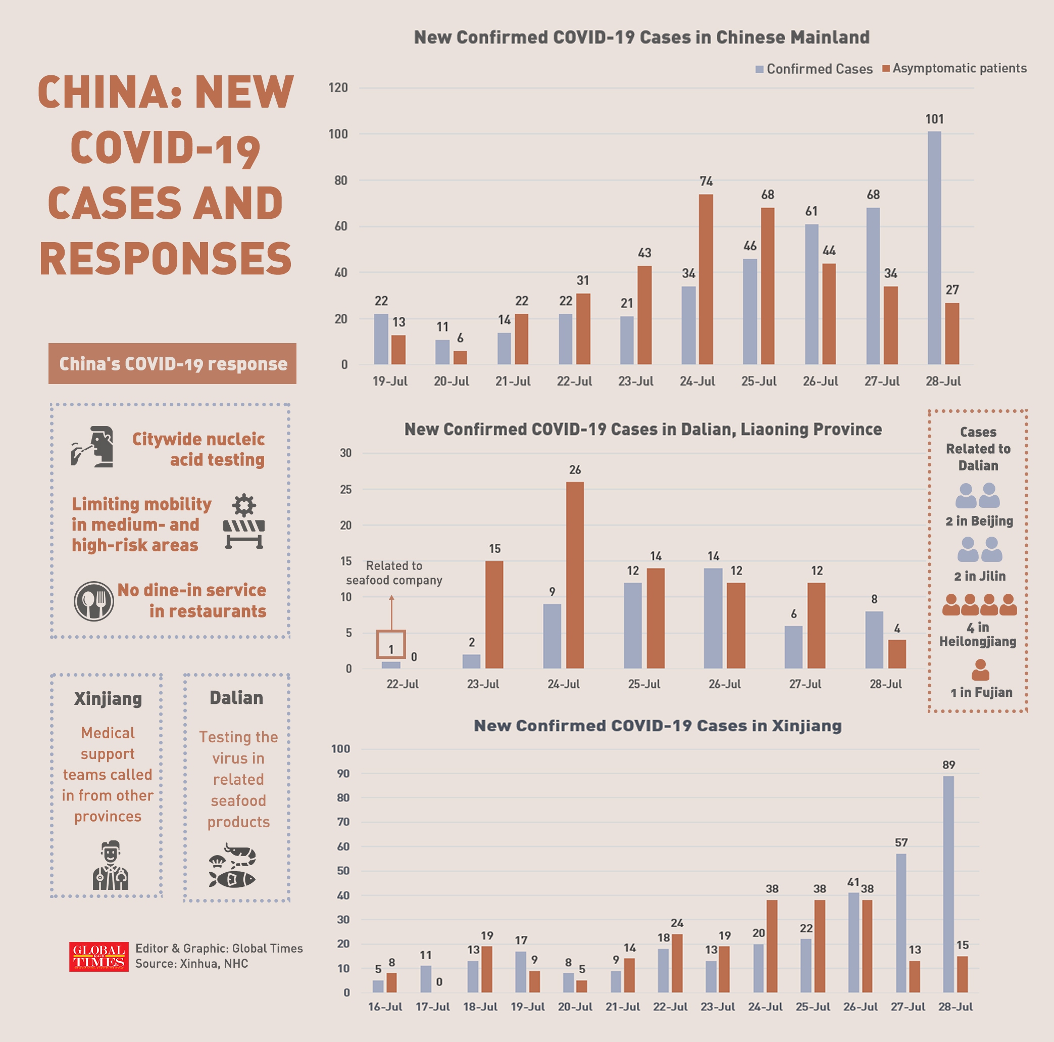 Of the new cases reported by the National Health Commission on Wednesday, 89 were reported in Xinjiang, eight in Northeast China's Liaoning Province, and one in Beijing, who was linked to the outbreak in Liaoning. There were also three imported cases.