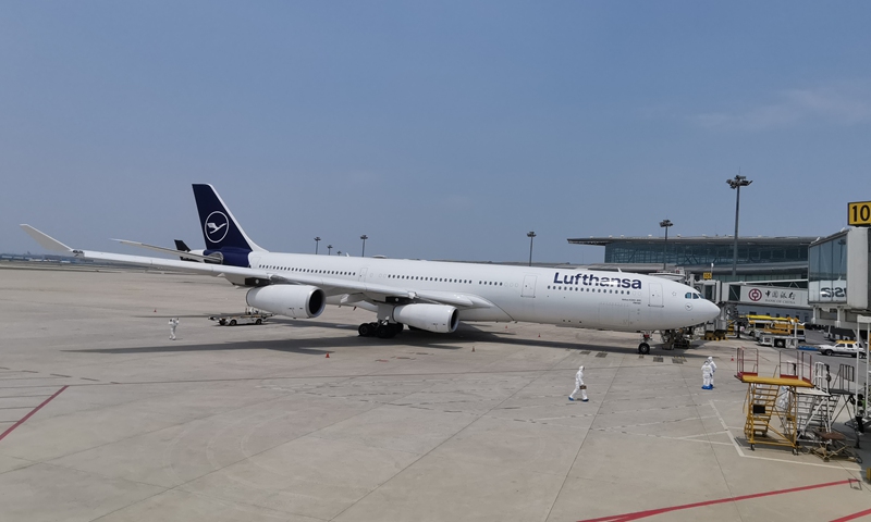 A flight carrying German business travelers from Frankfurt, jointly arranged by German Chamber of Commerce in China, German diplomatic missions, and Lufthansa airlines, landed in Tianjin on May 30. Photo: Courtesy of Lufthansa Group