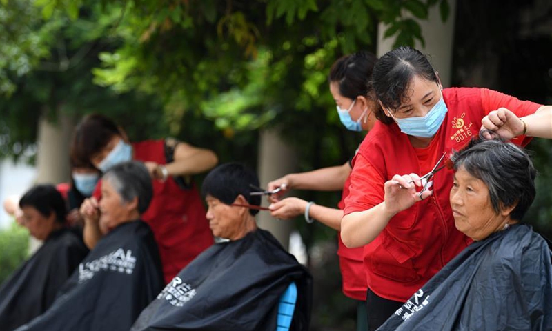 Volunteers cut hair for villagers at a temporary shelter in a school at Feixi County, east China's Anhui Province, July 29, 2020. Affected by floods, over 200 villagers in Fengle Town of Hefei were transferred to the school. Volunteers at the temporary shelter helped with the conveying of flood relief materials, food distribution, health care services, homework tutorship and free hairdressing services. (Xinhua/Liu Junxi)