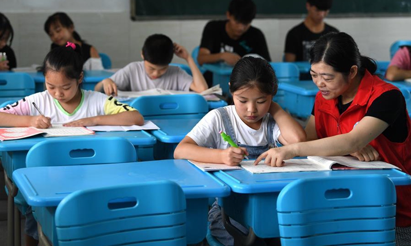 A volunteer tutors a girl at a temporary shelter in a school at Feixi County, east China's Anhui Province, July 29, 2020. Affected by floods, over 200 villagers in Fengle Town of Hefei were transferred to the school. Volunteers at the temporary shelter helped with the conveying of flood relief materials, food distribution, health care services, homework tutorship and free hairdressing services. (Xinhua/Liu Junxi)