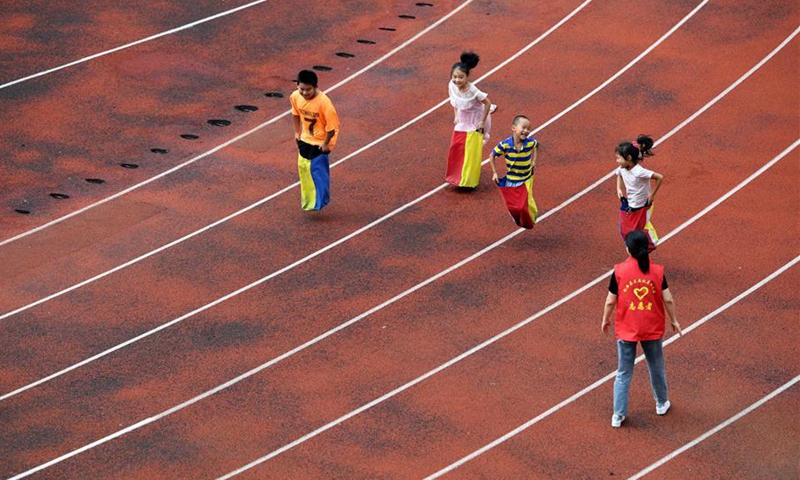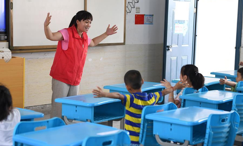 A volunteer plays game with children at a temporary shelter in a school at Feixi County, east China's Anhui Province, July 29, 2020. Affected by floods, over 200 villagers in Fengle Town of Hefei were transferred to the school. Volunteers at the temporary shelter helped with the conveying of flood relief materials, food distribution, health care services, homework tutorship and free hairdressing services. (Xinhua/Liu Junxi)