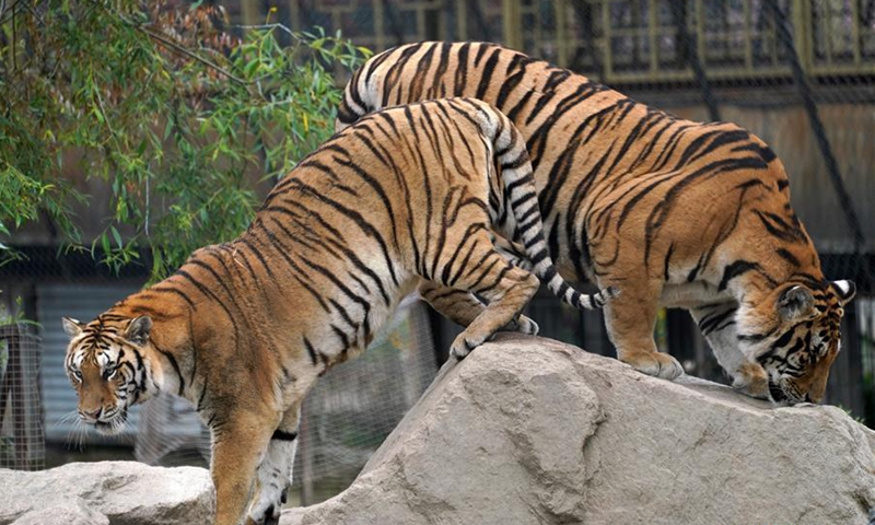 Photo taken on July 29, 2020 shows Siberian tigers on the move at a free-ranging area of the Hengdaohezi Siberian Tiger Park in Hailin, northeast China's Heilongjiang Province. The annual International Tiger Day, also known as Global Tiger Day, is celebrated on July 29. (Xinhua/Wang Jianwei)
