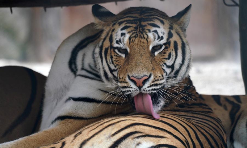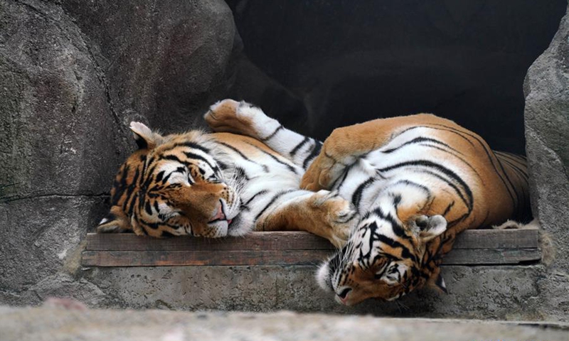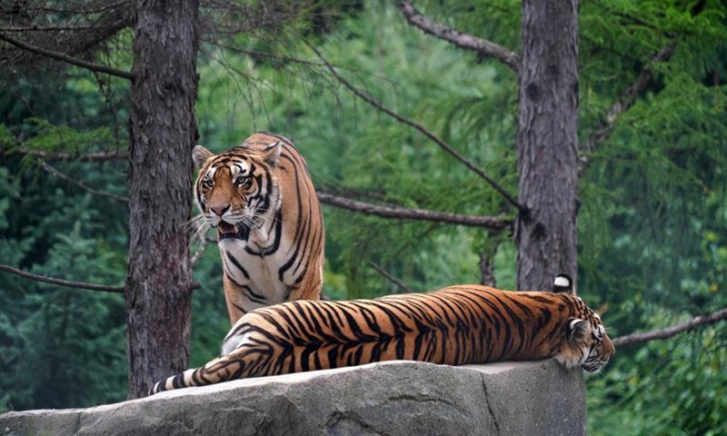 Siberian tigers rest at a free-ranging area of the Hengdaohezi Siberian Tiger Park in Hailin, northeast China's Heilongjiang Province, July 29, 2020. The annual International Tiger Day, also known as Global Tiger Day, is celebrated on July 29. (Xinhua/Wang Jianwei)