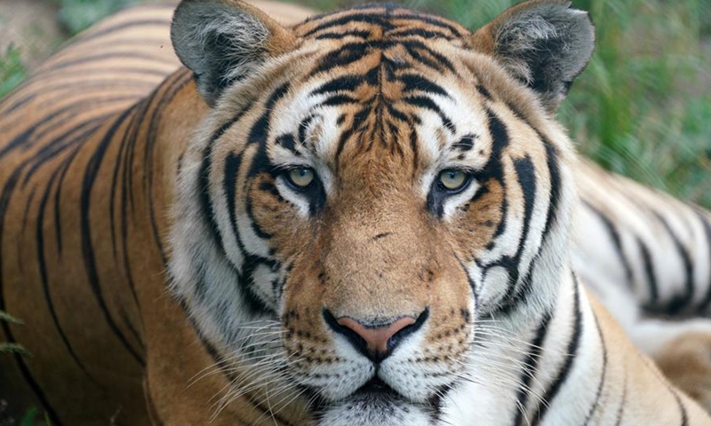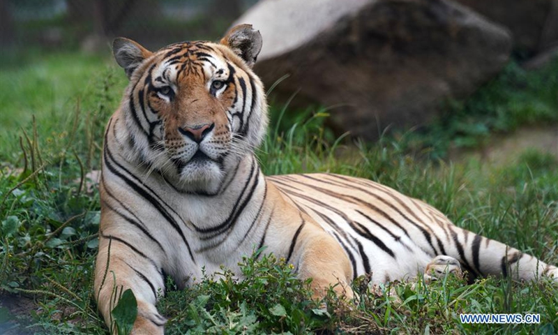 A Siberian tiger rests at a free-ranging area of the Hengdaohezi Siberian Tiger Park in Hailin, northeast China's Heilongjiang Province, July 29, 2020. The annual International Tiger Day, also known as Global Tiger Day, is celebrated on July 29. (Xinhua/Wang Jianwei)