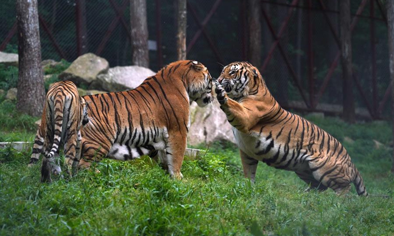 Siberian tigers frolic at a free-ranging area of the Hengdaohezi Siberian Tiger Park in Hailin, northeast China's Heilongjiang Province, July 29, 2020. The annual International Tiger Day, also known as Global Tiger Day, is celebrated on July 29. (Xinhua/Wang Jianwei)