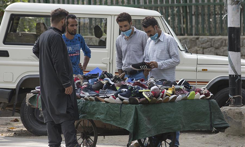 People buy shoes from a street vendor at a market ahead of the Eid Al-Adha festival in Srinagar, the summer capital of Indian-controlled Kashmir, July 29, 2020. (Xinhua/Javed Dar)