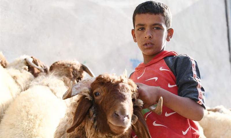 A Syrian boy holds a sheep at a livestock market in Damascus, capital of Syria, on July 29, 2020. Syrian people are busy making preparations for the upcoming Eid al-Adha, or the Feast of Sacrifice. (Photo by Ammar Safarjalani/Xinhua)