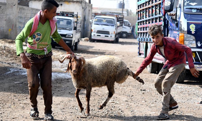 Syrian boys hold a sheep at a livestock market in Damascus, capital of Syria, on July 29, 2020. Syrian people are busy making preparations for the upcoming Eid al-Adha, or the Feast of Sacrifice. (Photo by Ammar Safarjalani/Xinhua)