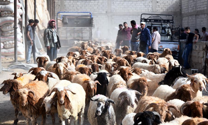 Sheep are seen at a livestock market in Damascus, capital of Syria, on July 29, 2020. Syrian people are busy making preparations for the upcoming Eid al-Adha, or the Feast of Sacrifice. (Photo by Ammar Safarjalani/Xinhua)