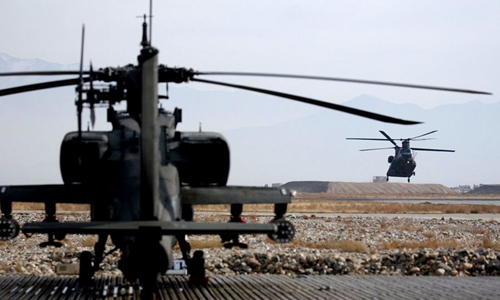A US military helicopter lands on Bagram Air Base 60 kilometers from Kabul, Afghanistan, Dec. 11, 2003. (Xinhua Photo/Wang Lei)