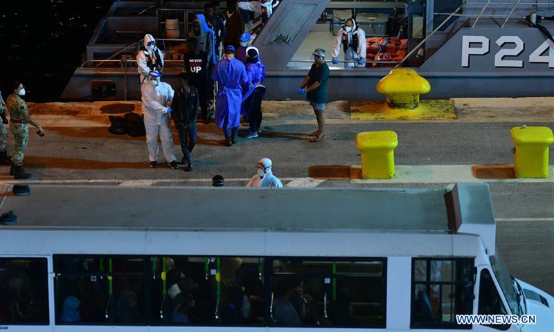 Migrants disembark at Boiler Wharf in Senglea, Malta, on July 8, 2020. A group of 52 migrants who were rescued from the high seas on Saturday were allowed to disembark in Malta, local media reported on Wednesday. (Photo by Jonathan Borg/Xinhua)
