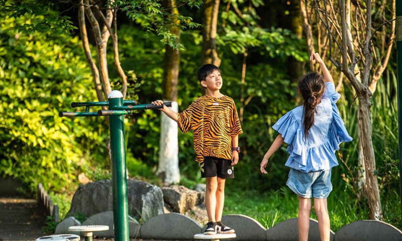 Children have fun at the Guanshan Lake Park in Guiyang City, southwest China's Guizhou Province, July 29, 2020. Covering an area of 5,500 Mu (about 367 hectares), the Guanshan Lake Park serves as the "green lungs" of Guiyang City. (Xinhua/Tao Liang)