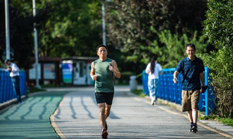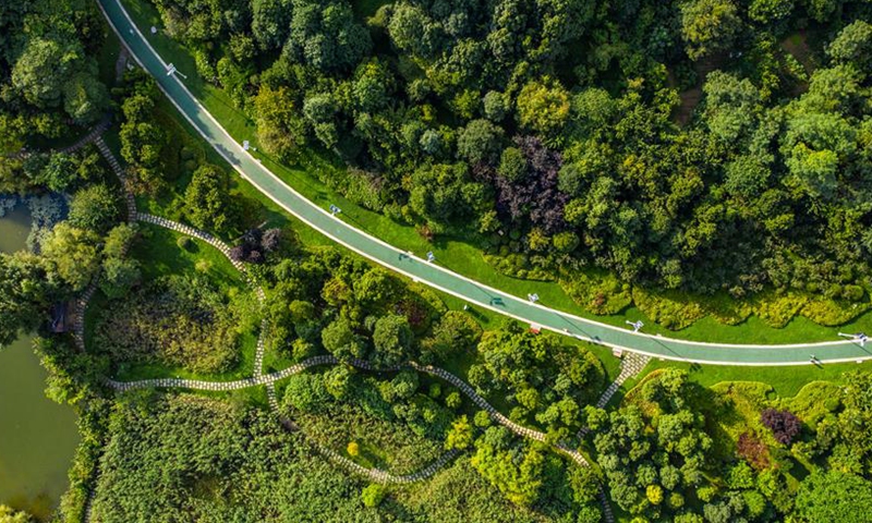 People exercise at the Guanshan Lake Park in Guiyang City, southwest China's Guizhou Province, July 29, 2020. Covering an area of 5,500 Mu (about 367 hectares), the Guanshan Lake Park serves as the "green lungs" of Guiyang City. (Xinhua/Tao Liang)