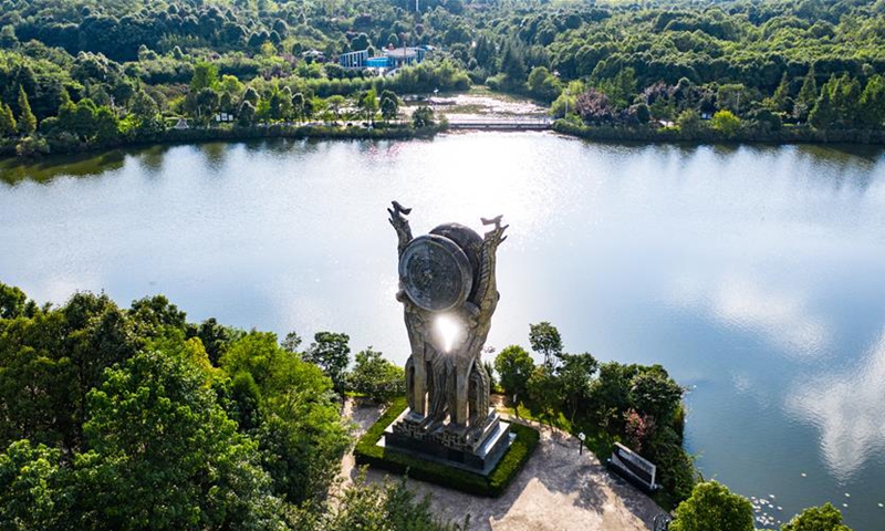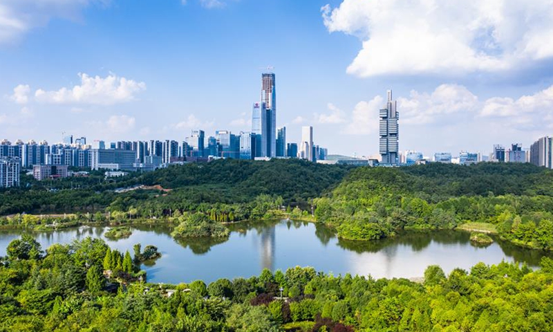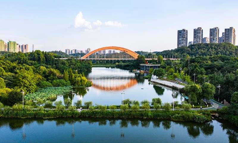 Aerial photo taken on July 29, 2020 shows the scenery at the Guanshan Lake Park in Guiyang City, southwest China's Guizhou Province. Covering an area of 5,500 Mu (about 367 hectares), the Guanshan Lake Park serves as the "green lungs" of Guiyang City. (Xinhua/Tao Liang)