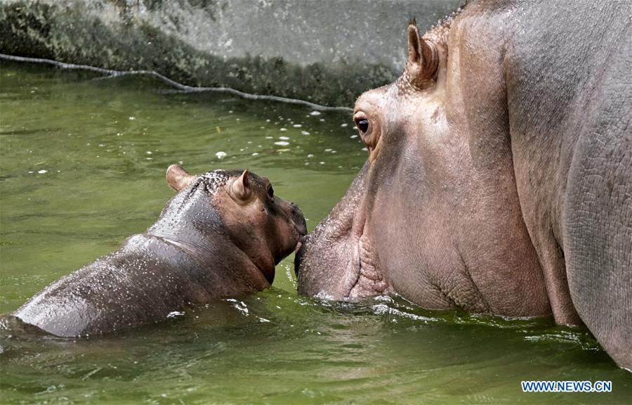 A hippopotamus cub and its mother cool off at a pond in Beijing Zoo in Beijing, capital of China, July 30, 2020. Beijing Zoo has prepared facilities to help animals fend off the summer heat in recent days. (Xinhua/Li Xin)