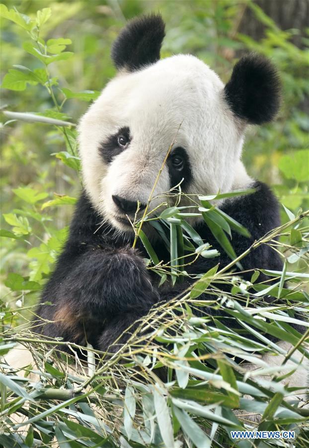 A giant panda eats bamboo at Beijing Zoo in Beijing, capital of China, July 30, 2020. Beijing Zoo has prepared facilities to help animals fend off the summer heat in recent days. (Xinhua/Li Xin)