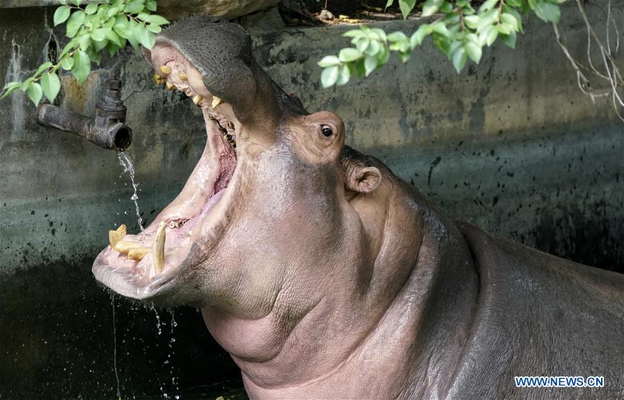 A hippopotamus drinks water at Beijing Zoo in Beijing, capital of China, July 30, 2020. Beijing Zoo has prepared facilities to help animals fend off the summer heat in recent days. (Xinhua/Li Xin)