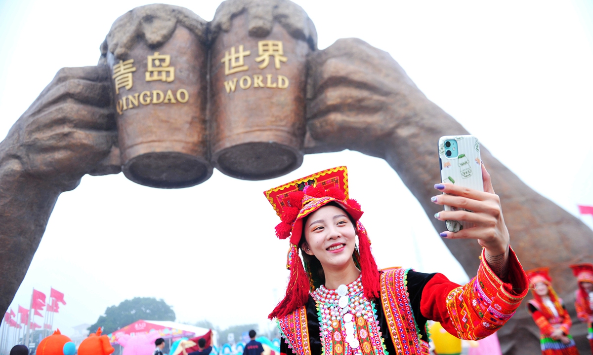 A woman takes photos at the Golden Beach Beer City in Qingdao, East China's Shandong Province on Friday. The 30th Qingdao International Beer Festival opened on Friday, drawing a large crowd. Photo: cnsphoto