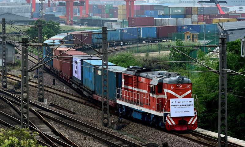 A China-Europe freight train carrying medical supplies bound for Madrid of Spain departs the city of Yiwu, east China's Zhejiang Province, June 5, 2020.Photo:Xinhua