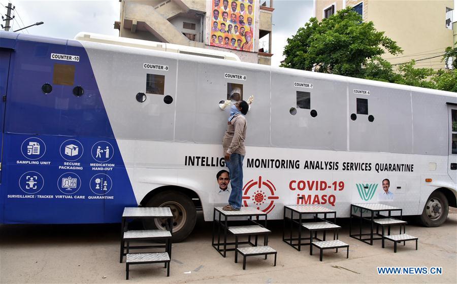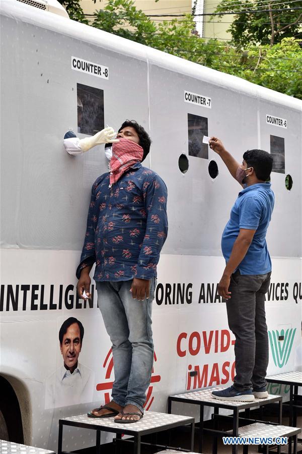 People have tests at a COVID-19 mobile testing facility in Hyderabad, India, on July 31, 2020. India recorded the highest ever single-day spike with 55,078 fresh COVID-19 cases, taking the total tally to 1,638,870, according to the federal health ministry. (Str/Xinhua)