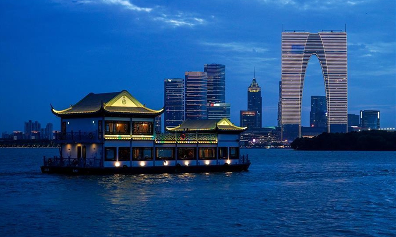 A tourist boat sails on the Jinji Lake in the Suzhou Industrial Park, Suzhou, east China's Jiangsu Province, July 31, 2020. (Xinhua/Li Bo)