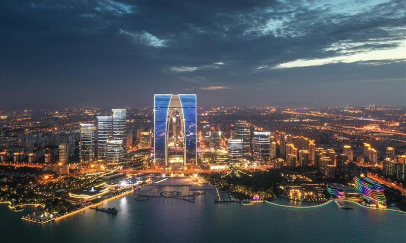 Photo taken with a drone shows modern buildings standing by the Jinji Lake in the Suzhou Industrial Park, Suzhou, east China's Jiangsu Province, July 30, 2020. (Xinhua/Yang Lei)