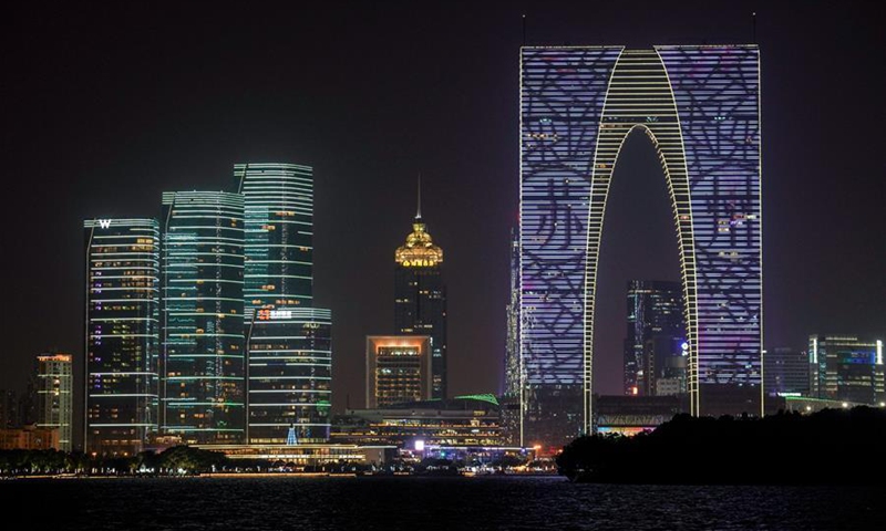 Photo taken on July 31, 2020 shows modern buildings standing by the Jinji Lake in the Suzhou Industrial Park, Suzhou, east China's Jiangsu Province. (Xinhua/Li Bo)