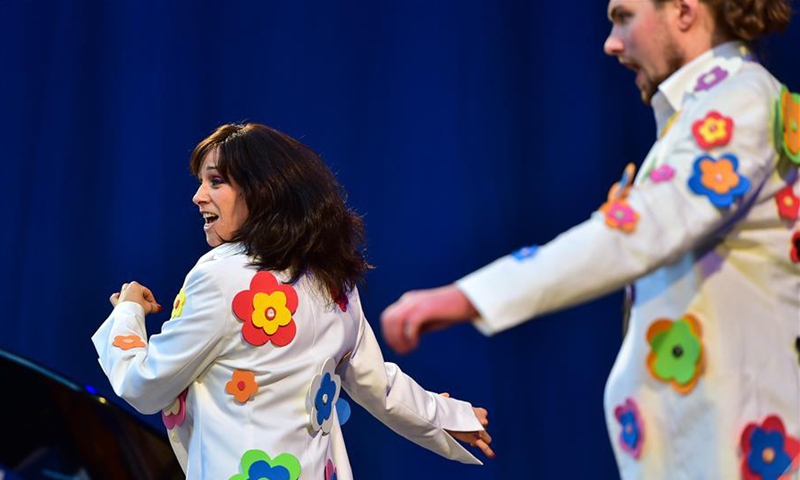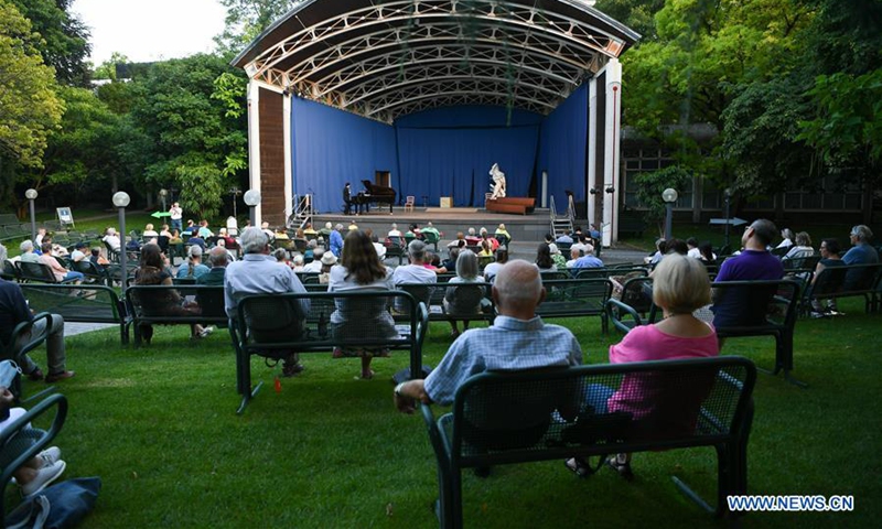 Artists perform during an outdoor concert at Palm Garden in Frankfurt, Germany, August 1, 2020. A series of concerts are held here from August 1 to 30 with strict COVID-19 control and prevention measures. (Xinhua/Lu Yang)