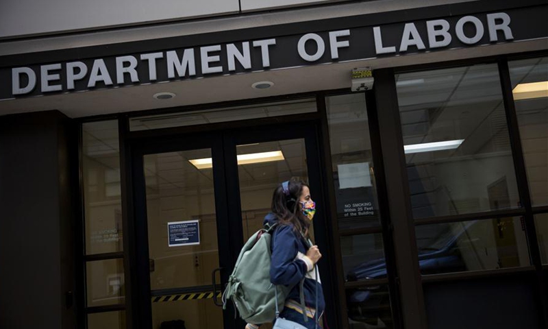 A pedestrian wearing a face mask walks past the New York State Department of Labor office in the Brooklyn borough of New York, the United States. Photo: Xinhua