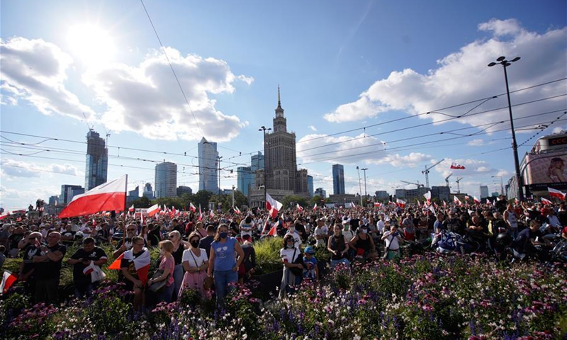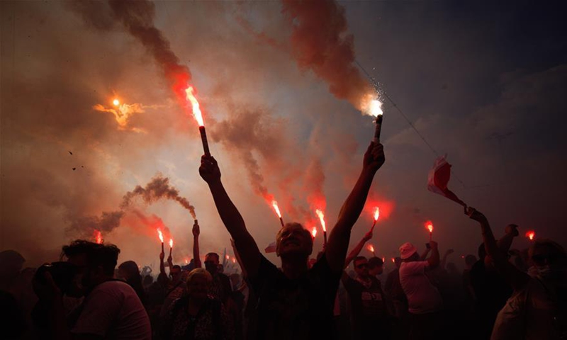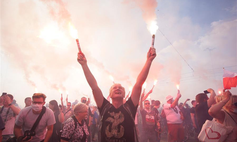 People gather to commemorate the Warsaw Uprising in Warsaw, Poland on Aug. 1, 2020. On Aug. 1, 1944, the Polish underground resistance, led by the Polish Home Army, began a major military operation to liberate Warsaw from Nazi occupation. The uprising, which lasted 63 days, was the largest military effort of any European resistance against Nazi Germany. (Photo by Jaap Arriens/Xinhua)