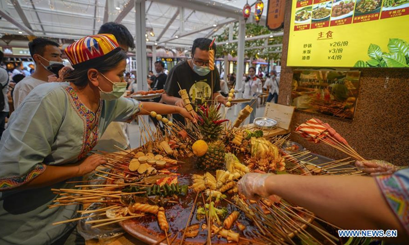 Customers select hot spicy snacks at the grand bazaar in Urumqi, capital of northwest China's Xinjiang Uygur Autonomous Region, July 4, 2020. Photo: Xinhua