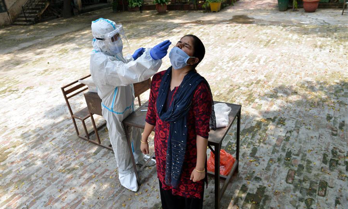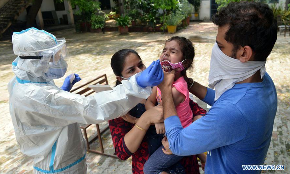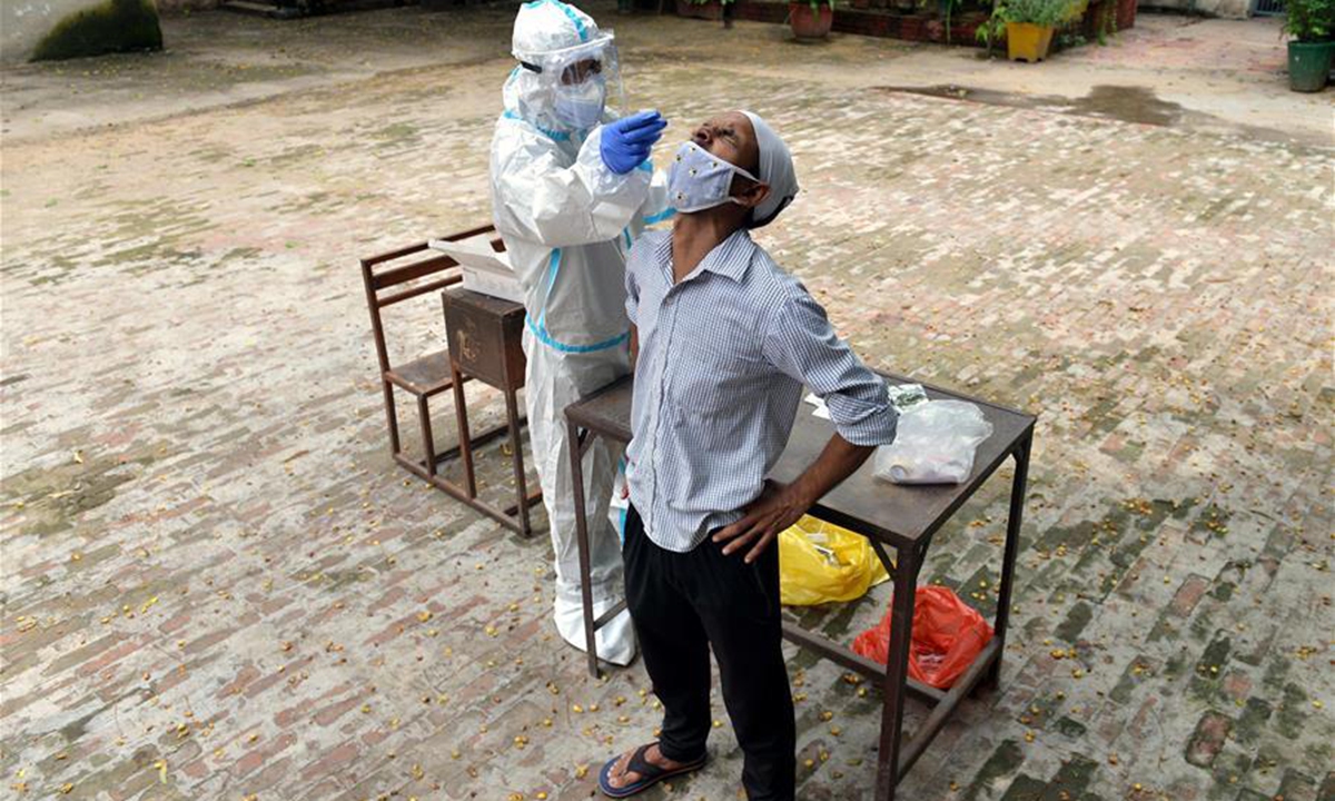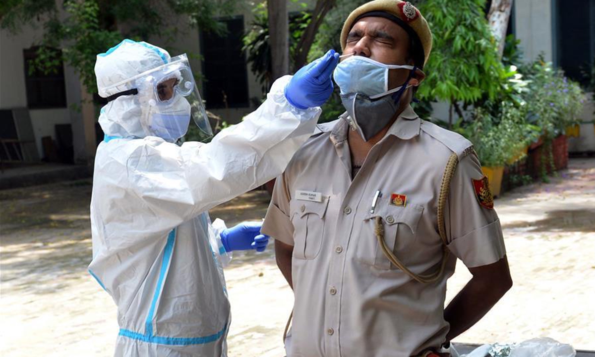 A health worker collects a sample for COVID-19 testing from a police officer in New Delhi, India on Aug. 2, 2020. India's COVID-19 tally crossed the 1.7 million-mark on Sunday, reaching 1,750,723, announced the federal health ministry. (Photo by Partha Sarkar/Xinhua)
