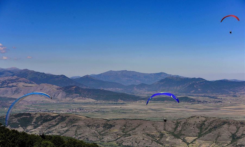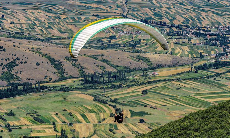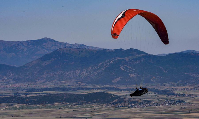 A paraglider takes part in an outdoor activity near Krusevo, North Macedonia on Aug. 2, 2020. (Photo by Tomislav Georgiev/Xinhua)
