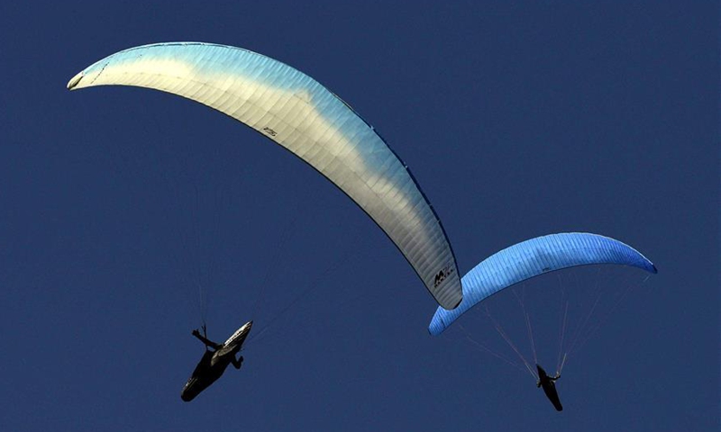Paragliders take part in an outdoor activity near Krusevo, North Macedonia on Aug. 2, 2020. (Photo by Tomislav Georgiev/Xinhua)