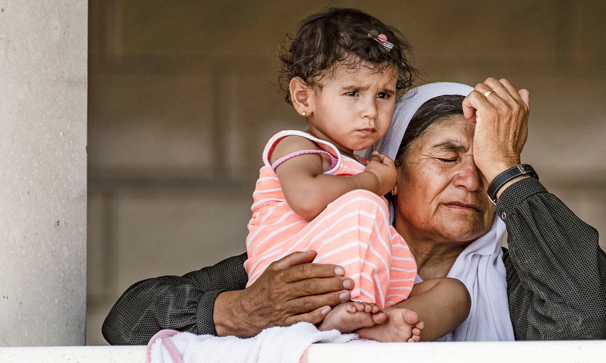 A Syrian woman, who was stranded following a border closure due to the COVID-19 pandemic, waits with a child to cross into Iraqi Kurdistan from the Syrian side of the Semalka border crossing in northeast¬ern Syria on Wednesday. A spokesman for the Iraqi Armed Forces stressed the importance and necessity of protecting the border between Syria and Iraq on the same day. Photo: AFP