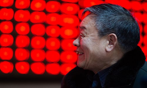 An individual investor follows the stock market at a bourse in Nanjing, East China's Jiangsu Province, on Monday. The Shanghai Composite Index rose 5.6 percent, while trading volumes on the Shanghai and Shenzhen bourses surpassed 1 trillion yuan ($150 billion) on Monday. Photo: VCG