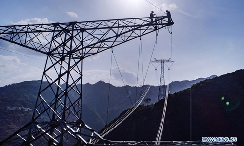 Workers install overhead power lines for an 800KV direct current electricity transmission project linking northwest China's Qinghai Province and central China's Henan Province, in Zhen'an County of northwest China's Shaanxi Province, May 8, 2020. (Xinhua/Tao Ming)