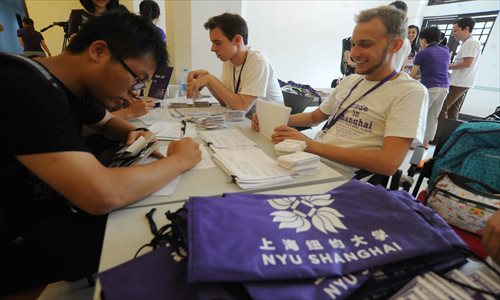 Freshmen students register for classes at New York University Shanghai Sunday at its temporary home within East China Normal University (ECNU). The students will study at ECNU for a year before moving to NYU Shanghai's permanent campus, which is still under construction in Pudong New Area. Photo: Yang Hui/GT