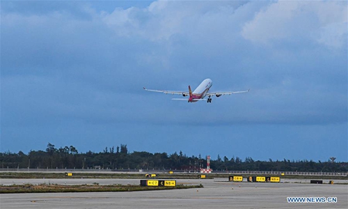 An aircraft conducts a test flight for the second phase of the expansion project of the Haikou Meilan International Airport in Haikou, south China's Hainan Province, July 30, 2020. The second phase of the airport expansion project started test flight on Thursday. (Xinhua/Pu Xiaoxu)