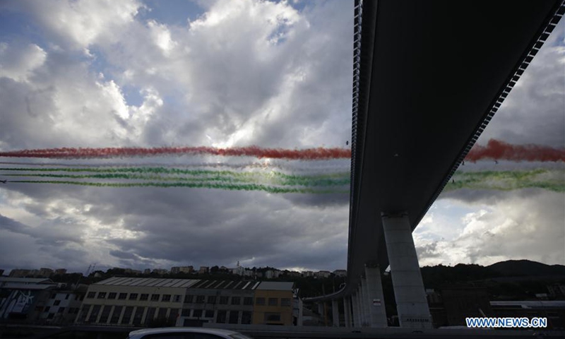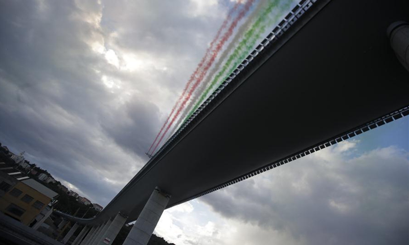 The Italian Frecce Tricolori (Tricolor Arrows) aerobatics team fly over the new Genoa Saint George Bridge in Genoa, Italy, Aug 3, 2020. Italy's new Genoa Saint George Bridge, which replaces the viaduct that collapsed two years ago and killed 43 people, was inaugurated in the northwestern port city of Genoa on Monday. (Str/Xinhua)