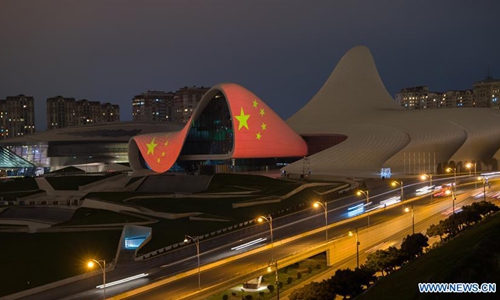 The Heydar Aliyev Center is lit up with the image of the Chinese national flag to support China's efforts in fighting against the COVID-19 outbreak, in Baku, Azerbaijan, April 3, 2020. (Xinhua)