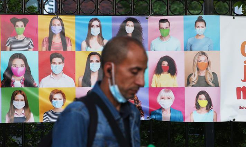 A man walks past a poster reading "This summer I wear a mask when I go out" in Clichy, next to Paris, France, Aug. 4, 2020. Amid signs of the epidemic resurgence, Paris is considering ordering people to wear masks in busy outdoor public spaces after the government authorized local authorities to toughen rule to contain coronavirus circulation during summer holidays. Parisians and visitors will have to wear a mask when they stroll along the banks of the Seine, visit the capital's open-air markets or main tourist spots. (Xinhua/Gao Jing)