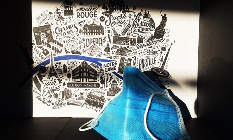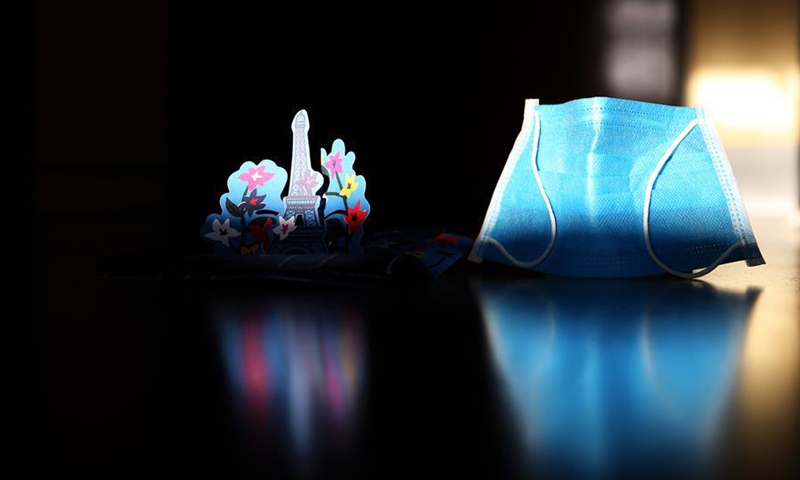 A protective mask is seen beside an Eiffel Tower paper model in Paris, France, Aug. 4, 2020. Amid signs of the epidemic resurgence, Paris is considering ordering people to wear masks in busy outdoor public spaces after the government authorized local authorities to toughen rule to contain coronavirus circulation during summer holidays. Parisians and visitors will have to wear a mask when they stroll along the banks of the Seine, visit the capital's open-air markets or main tourist spots. (Xinhua/Gao Jing)