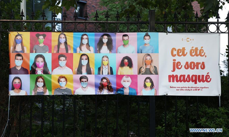 A poster reading "This summer I wear a mask when I go out" is seen in Clichy, next to Paris, France, Aug. 4, 2020. Amid signs of the epidemic resurgence, Paris is considering ordering people to wear masks in busy outdoor public spaces after the government authorized local authorities to toughen rule to contain coronavirus circulation during summer holidays. Parisians and visitors will have to wear a mask when they stroll along the banks of the Seine, visit the capital's open-air markets or main tourist spots. (Xinhua/Gao Jing)