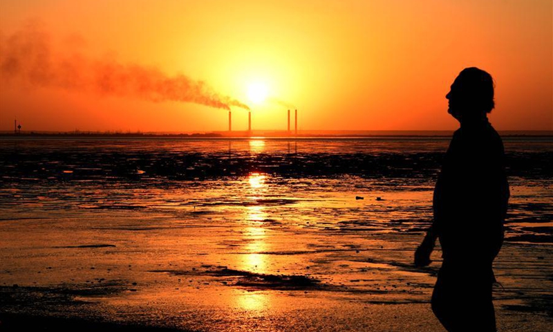 A local resident walks on the beach during sunset in Kuwait City, Kuwait, Aug. 4, 2020. (Photo by Ghazy Qaffaf/Xinhua)